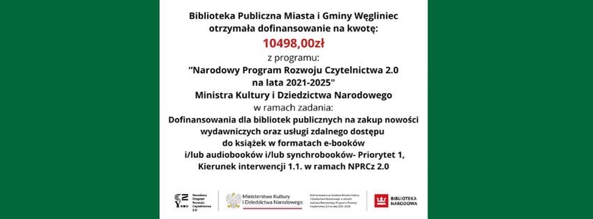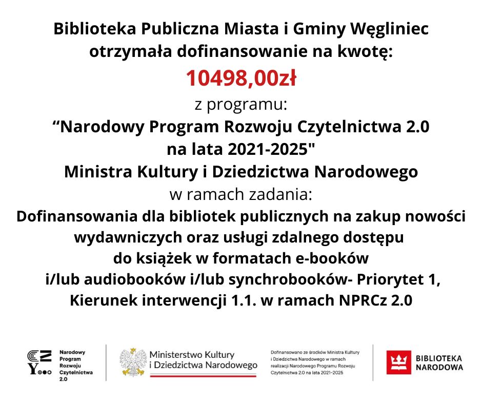 Z radością informujemy, że Biblioteka Publiczna w Węglińcu otrzymała dofinansowanie w wysokości 10 498 zł na zakup nowości książkowych!