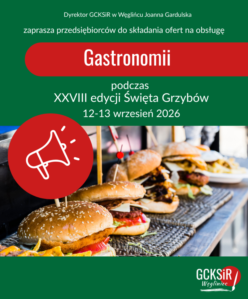 W związku z trwającymi przygotowaniami do XXVIII edycji Święta Grzybów, zapraszamy przedsiębiorców do składania ofert na obsługę Gastronomii. Szczegóły związane z procedurą składania ofert zawarte są w załącznikach.