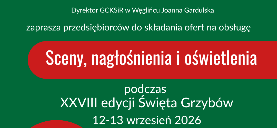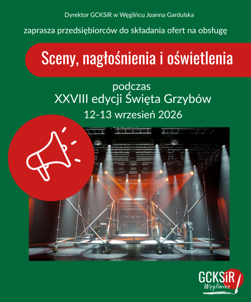 Zapraszamy przedsiębiorców do składania ofert na obsługę Sceny, nagłośnienia i oświetlenia podczas imprezy plenerowej XXVIII edycja Święta Grzybów. Szczegóły dotyczące procedury i materiały do pobrania w załączeniu.
